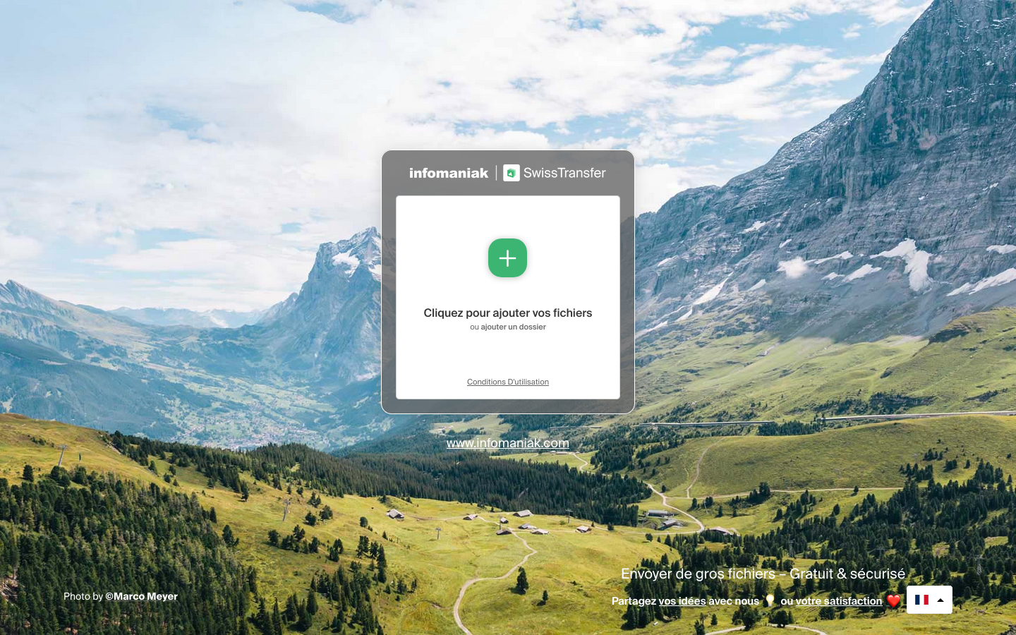 A screenshot of the SwissTransfer landing page. Has looked the same for many years.